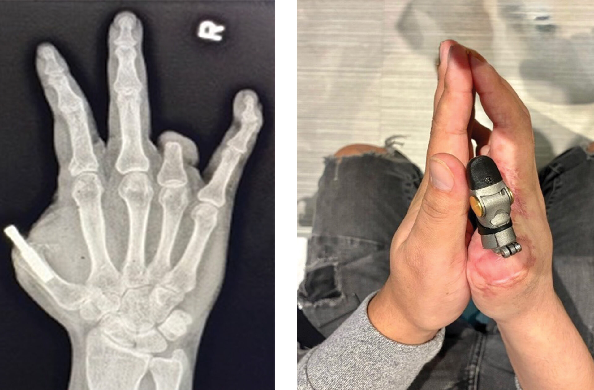 (L) Postoperative X-ray of the patient’s right hand showing ring finger amputation at proximal phalanx and thumb amputation at MP joint after a work-related injury; (R) The patient’s osseoanchored prosthesis after the surgery. Source: NYU Langone Health.