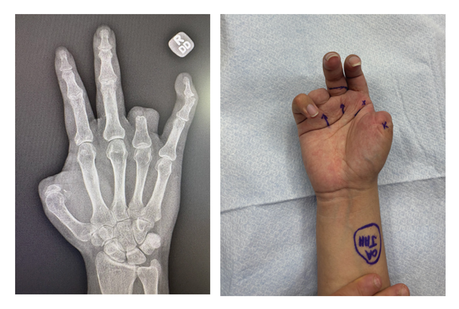 (L) Preoperative X-ray of the patient’s right hand; (R) Photograph of the same hand. Source: NYU Langone Health.